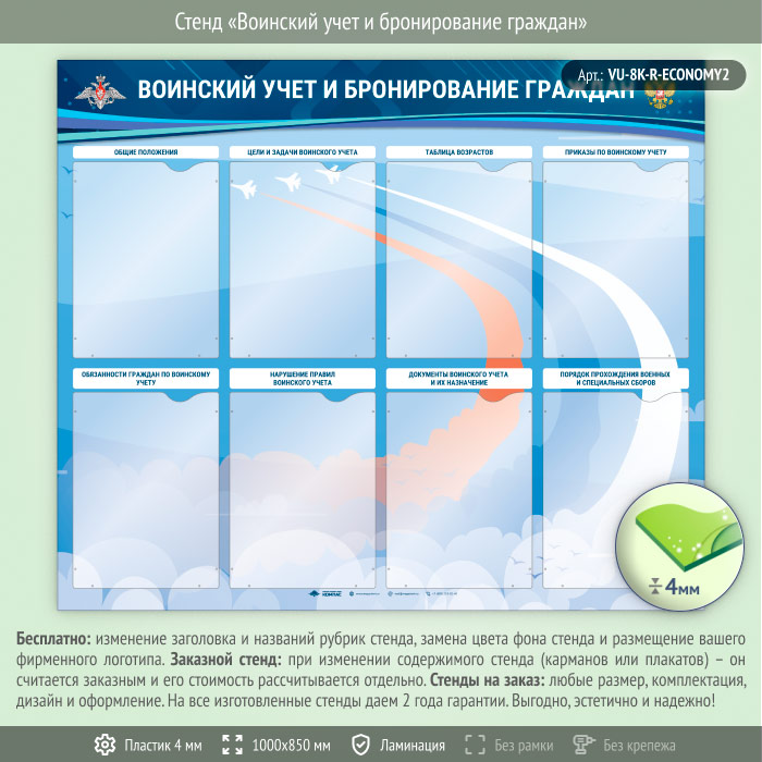 Стенд «Воинский учет и бронирование граждан» с 8 карманами А4 формата (VU-8K-R-ECONOMY2) в Черкесске купить