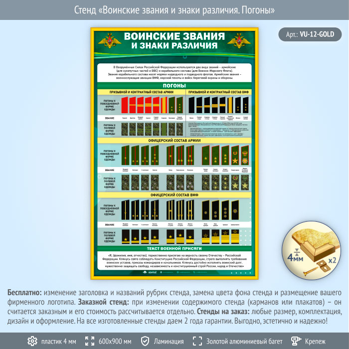 Стенд «Воинские звания и знаки различия. Погоны» (VU-12-GOLD) в Черкесске купить