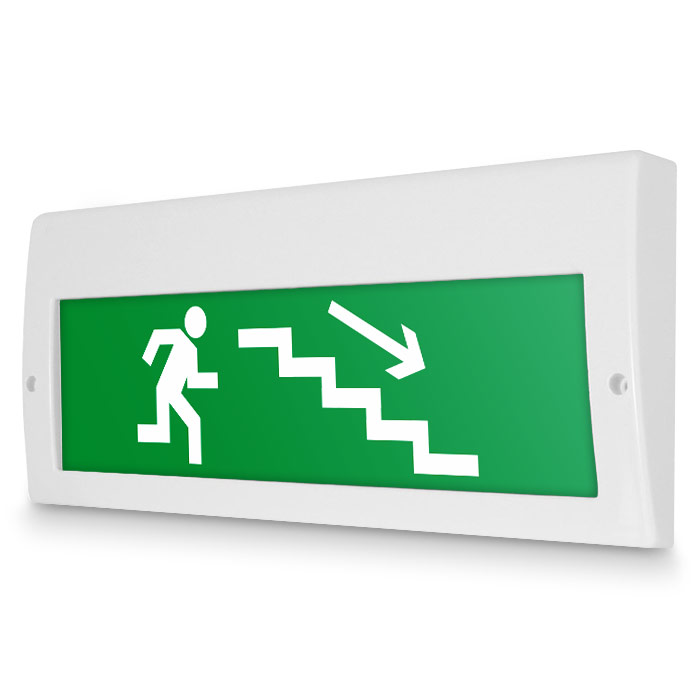 Световое табло «Направление к эвакуационному выходу по лестнице вниз (правосторонний)», Молния (220В РИП) в Черкесске купить