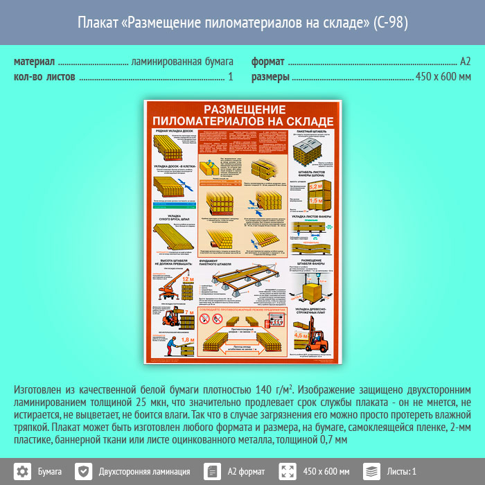 Плакат «Размещение пиломатериалов на складе» (С-98, ламинированная бумага, А2, 1 лист) в Черкесске купить