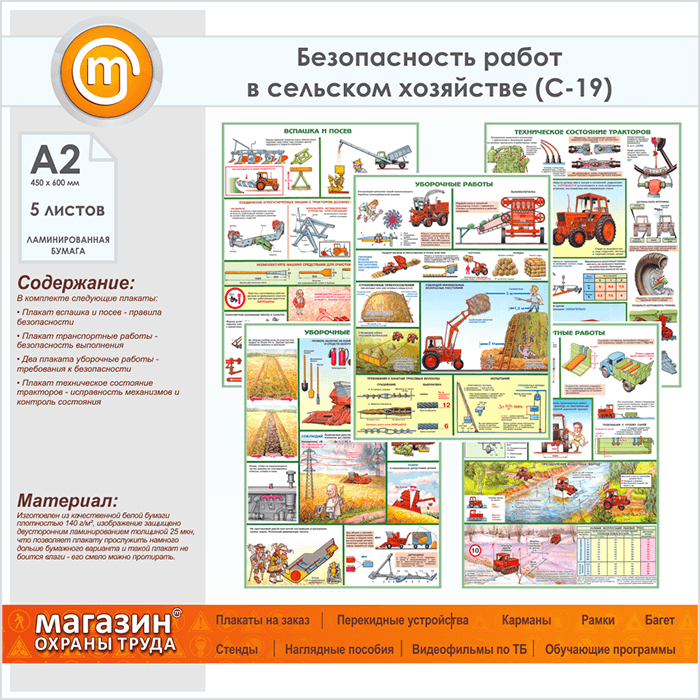 Плакаты «Безопасность работ в сельском хозяйстве» (С-19, ламинированная бумага, А2, 5 листов) в Черкесске купить
