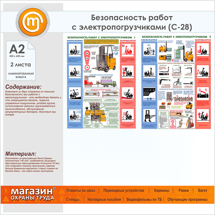Плакаты «Безопасность работ с электропогрузчиками» (С-28, ламинированная бумага, А2, 2 листа) в Черкесске купить