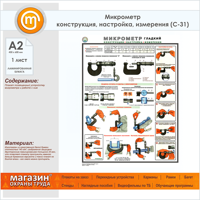 Плакат «Микрометр - конструкция, настройка, измерения» (С-31, ламинированная бумага, А2, 1 лист) в Черкесске купить
