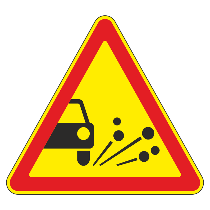 Дорожный знак 1.18 «Выброс гравия» (временный) (металл 0,8 мм, II типоразмер: сторона 900 мм, С/О пленка: тип А инженерная) в Черкесске купить