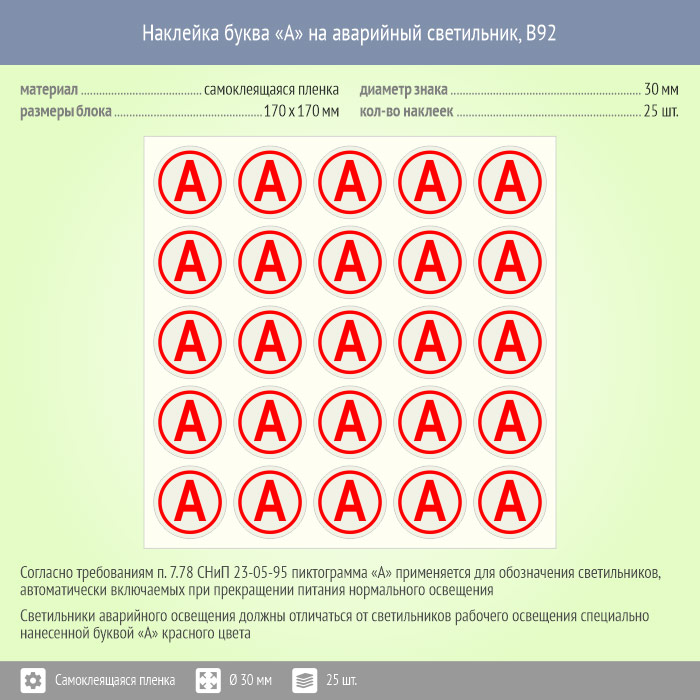 Наклейка буква «А» на аварийный светильник, B92 (пленка, диаметр 30 мм, блок 25 штук, 170х170 мм) в Черкесске купить