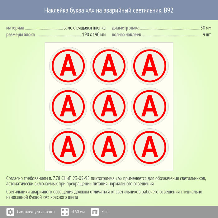 Наклейка буква «А» на аварийный светильник, B92 (пленка, диаметр 50 мм, блок 9 штук, 190х190 мм) в Черкесске купить