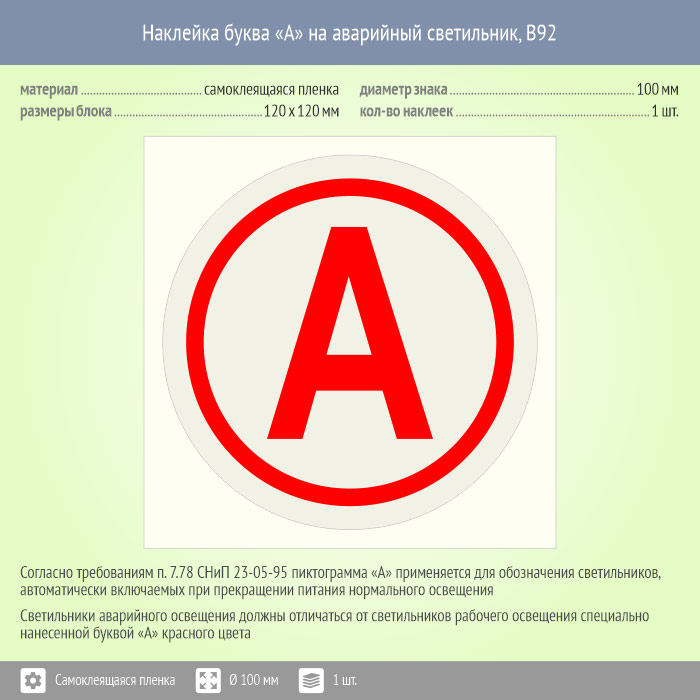 Наклейка буква «А» на аварийный светильник, B92 (пленка, диаметр 100 мм, 120х120 мм) в Черкесске купить