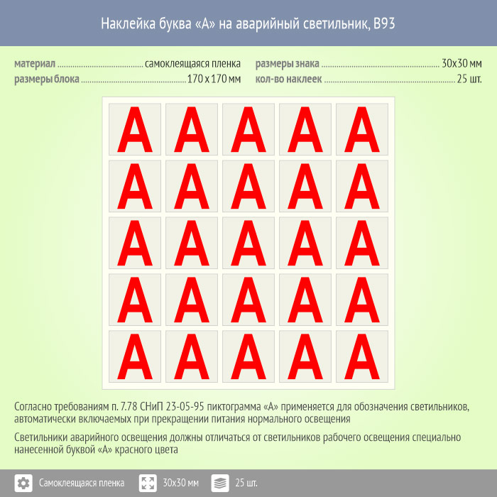 Наклейка буква «А» на аварийный светильник, B93 (пленка, 30х30 мм, блок 25 штук, 170х170 мм) в Черкесске купить
