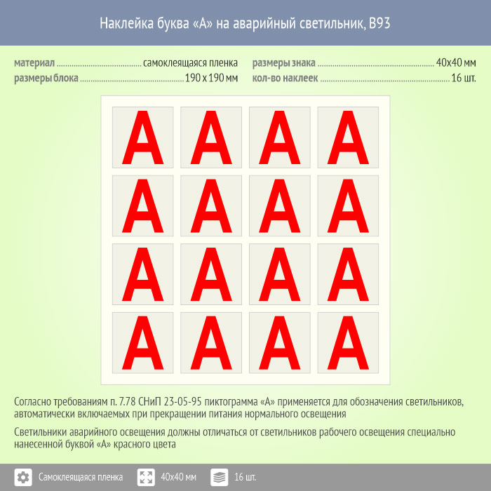 Наклейка буква «А» на аварийный светильник, B93 (пленка, 40х40 мм, блок 16 штук, 190х190 мм) в Черкесске купить