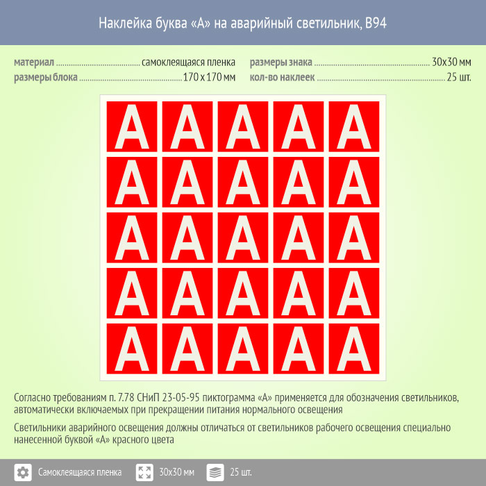 Наклейка буква «А» на аварийный светильник, B94 (пленка, 30х30 мм, блок 25 штук, 170х170 мм) в Черкесске купить