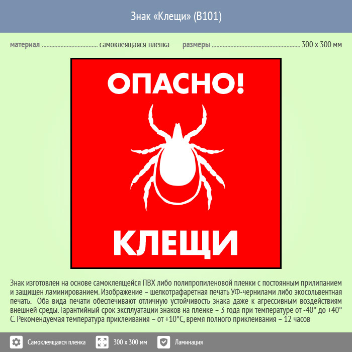Знак «Опасно! Клещи», B101 (пленка c ламинированием, 300х300 мм) в Черкесске купить
