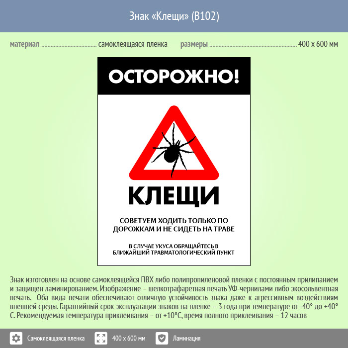 Знак «Осторожно! Клещи», B102 (пленка c ламинированием, 300х400 мм) в Черкесске купить