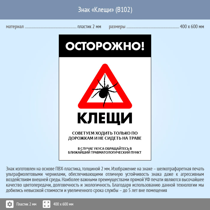 Знак «Осторожно! Клещи», B102 (пластик, 300х400 мм) в Черкесске купить