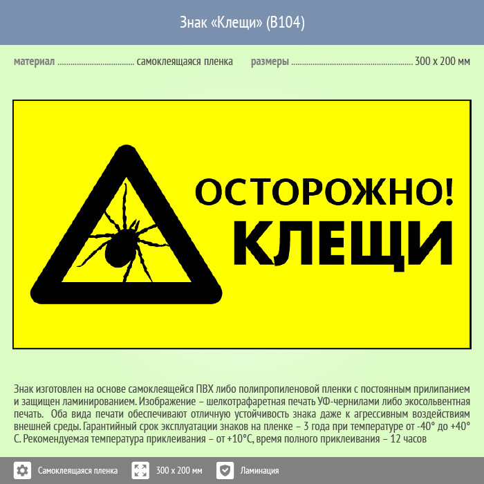 Знак «Осторожно! Клещи», B104 (пленка c ламинированием, 400х300 мм) в Черкесске купить