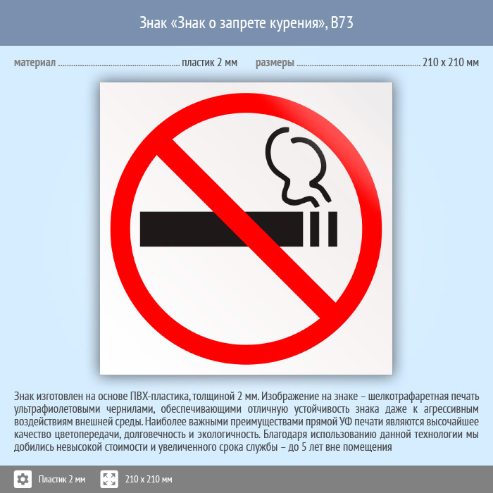 Знак «Знак о запрете курения», B73 (пластик, 210х210 мм) в Черкесске купить