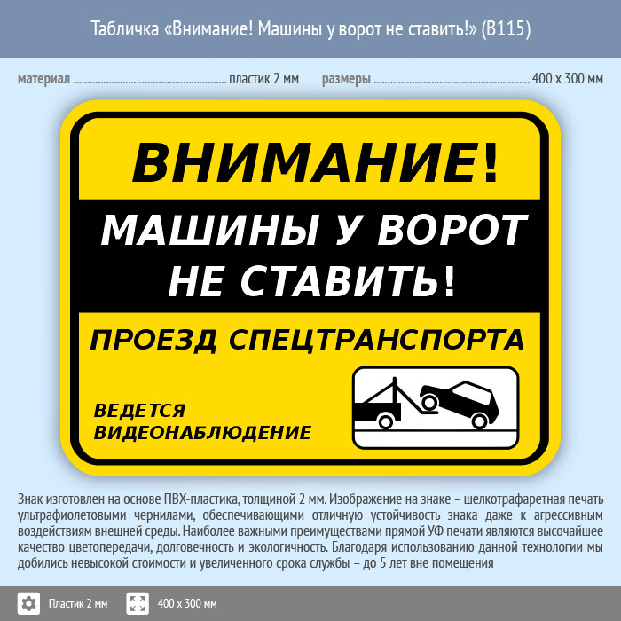 Табличка «Внимание! Машины у ворот не ставить!», B115 (пластик, 400х300 мм) в Черкесске купить