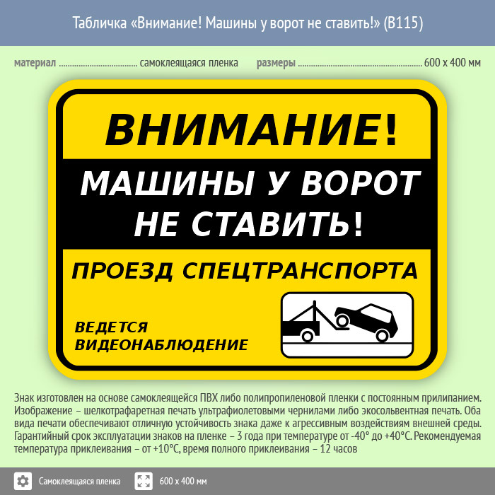 Табличка «Внимание! Машины у ворот не ставить!», B115 (пленка, 600х400 мм) в Черкесске купить