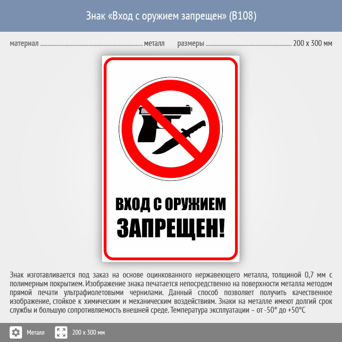Знак «Вход с оружием запрещен», B108 (металл, 200х300 мм) в Черкесске купить
