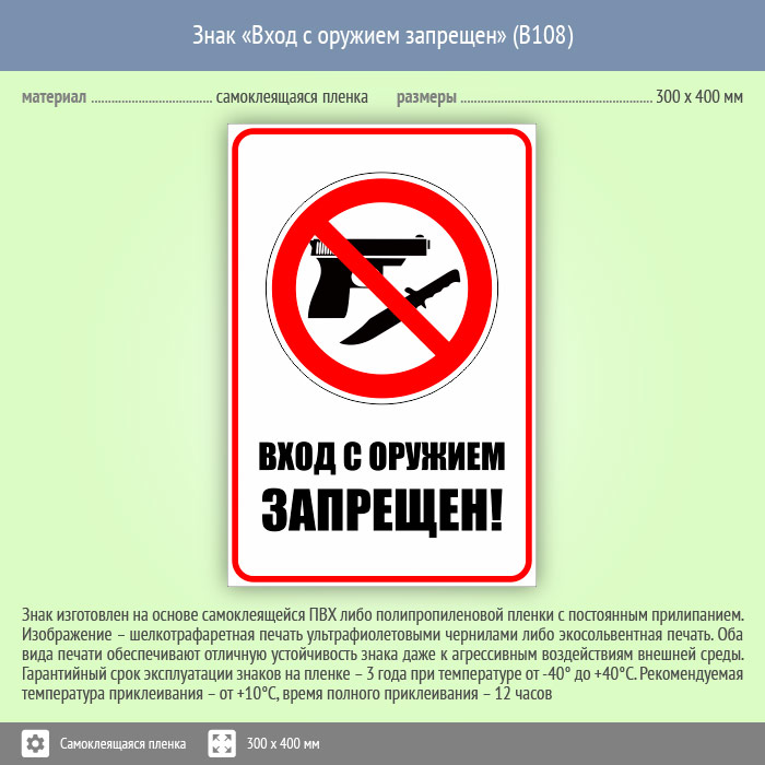 Знак «Вход с оружием запрещен», B108 (пленка, 300х400 мм) в Черкесске купить