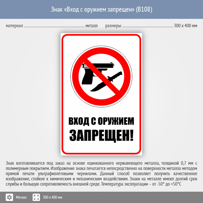 Знак «Вход с оружием запрещен», B108 (металл, 300х400 мм) в Черкесске купить