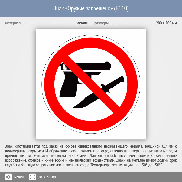 Знак «Оружие запрещено», B110 (металл, 200х200 мм) в Черкесске купить