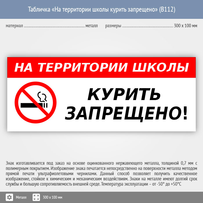 Табличка «На территории школы курить запрещено», B112 (металл, 300х100 мм) в Черкесске купить