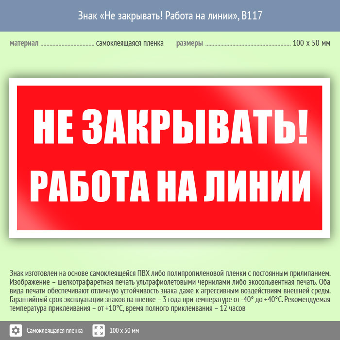 Знак «Не закрывать! Работа на линии», B117 (пленка, 100х50 мм) в Черкесске купить