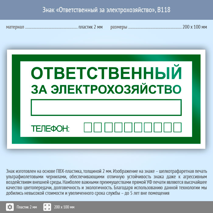Знак «Ответственный за электрохозяйство», B118 (пластик, 200х100 мм) в Черкесске купить