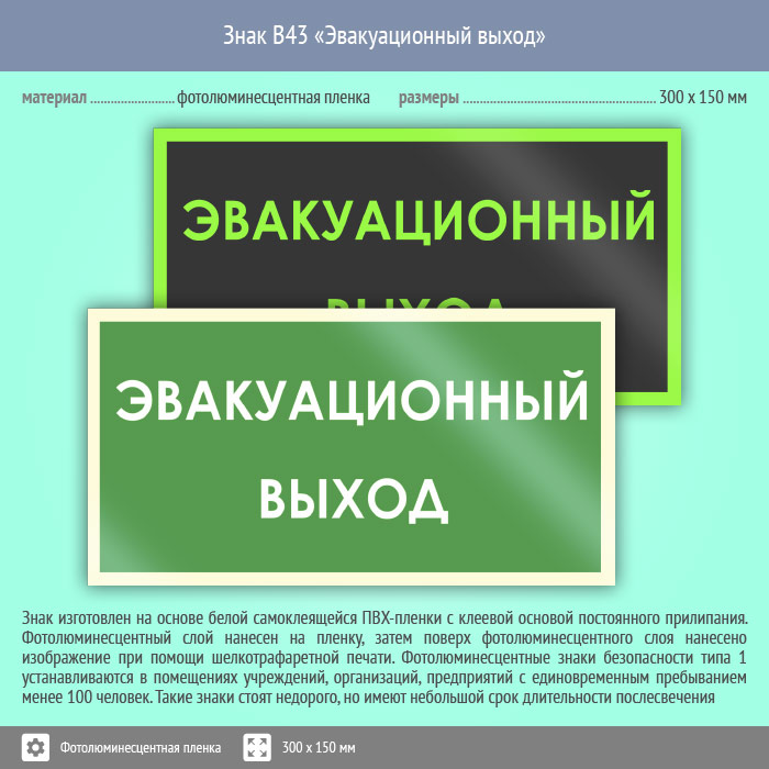 Знак B43 «Эвакуационный выход» (фотолюминесцентная пленка, 300х150 мм) в Черкесске купить