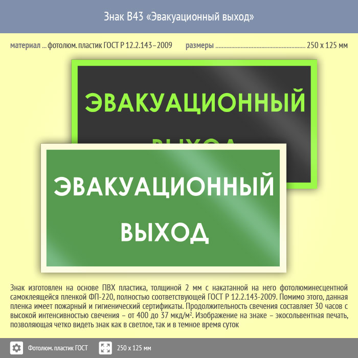 Знак B43 «Эвакуационный выход» (фотолюминесцентный пластик ГОСТ 34428-2018, 250х125 мм) в Черкесске купить