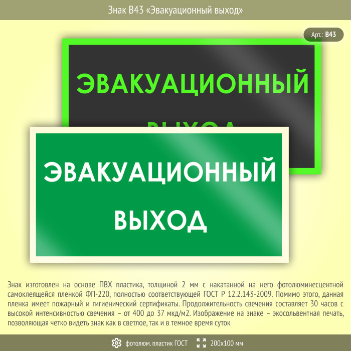 Знак B43 «Эвакуационный выход» (фотолюминесцентный пластик ГОСТ 34428-2018, 200х100 мм) в Черкесске купить