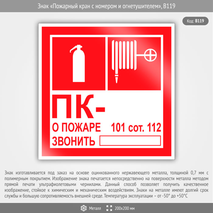 Знак «Пожарный кран с номером и огнетушителем», B119 (металл, 200х200 мм) в Черкесске купить