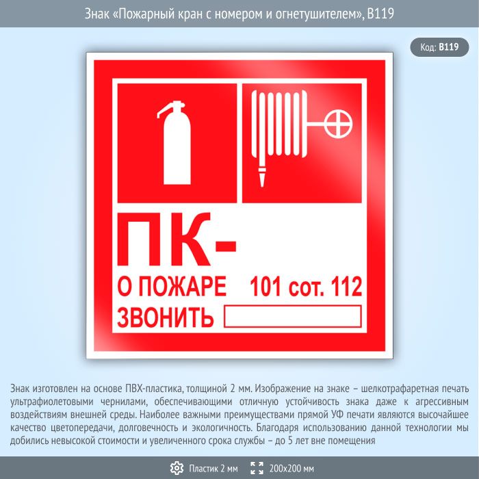Знак «Пожарный кран с номером и огнетушителем», B119 (пластик, 200х200 мм) в Черкесске купить