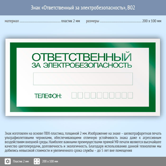 Знак «Ответственный за электробезопасность», B02 (пластик, 200х100 мм) в Черкесске купить