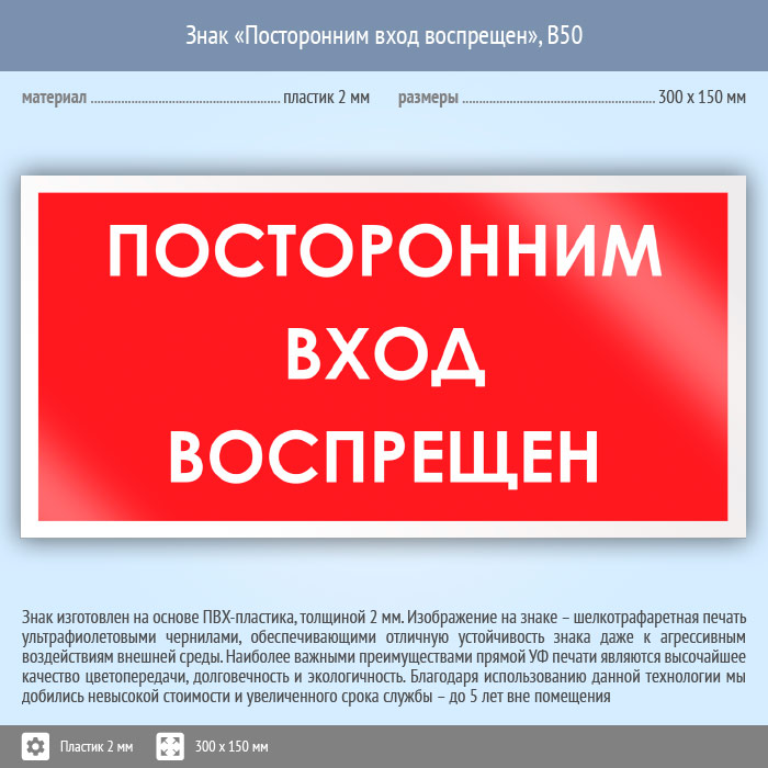 Знак «Посторонним вход воспрещен», B50 (пластик, 300х150 мм) в Черкесске купить