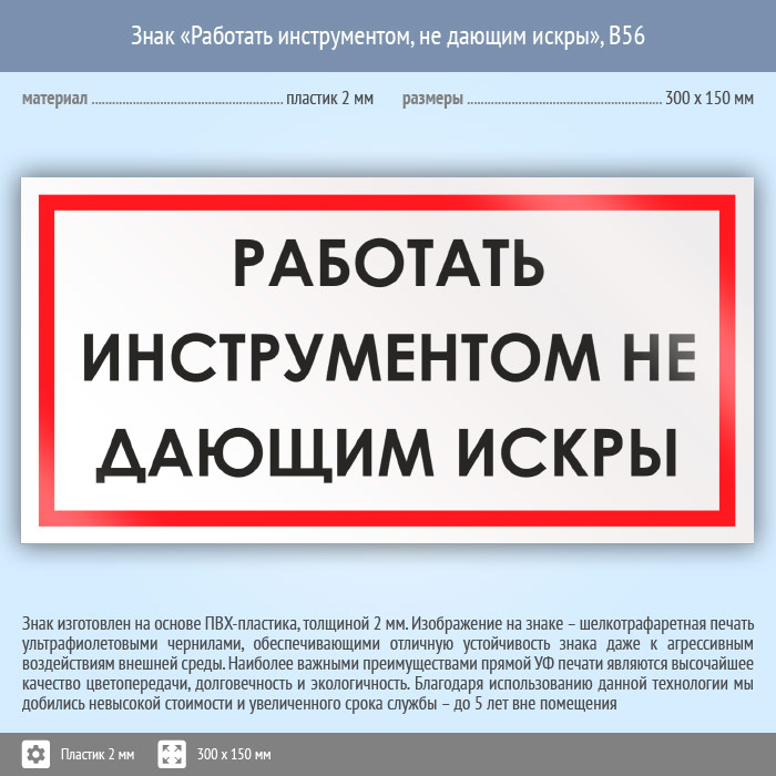Знак «Работать инструментом, не дающим искры», B56 (пластик, 300х150 мм) в Черкесске купить