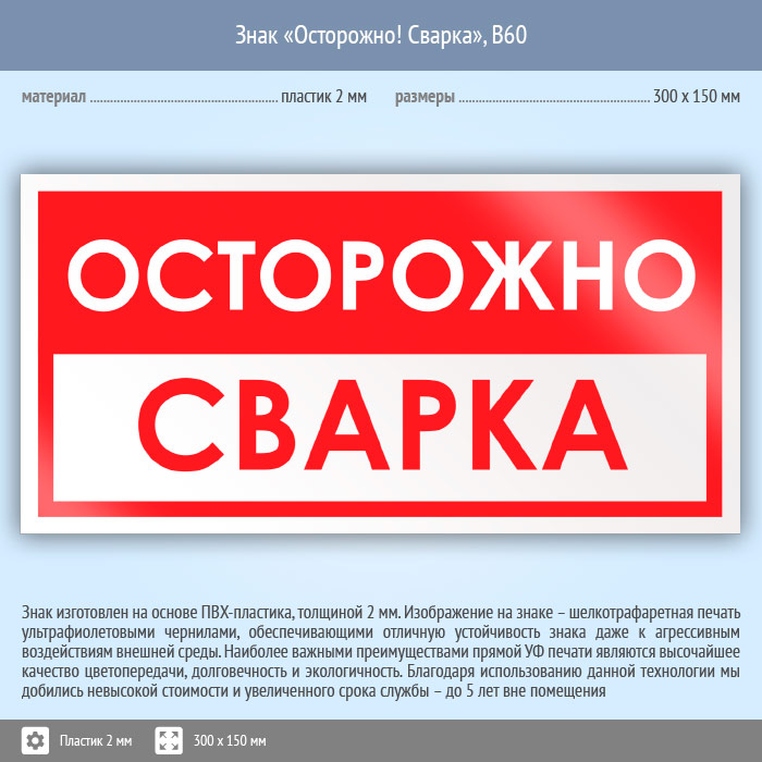 Знак «Осторожно! Сварка», B60 (пластик, 300х150 мм) в Черкесске купить