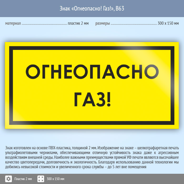 Знак «Огнеопасно! Газ!», B63 (пластик, 300х150 мм) в Черкесске купить