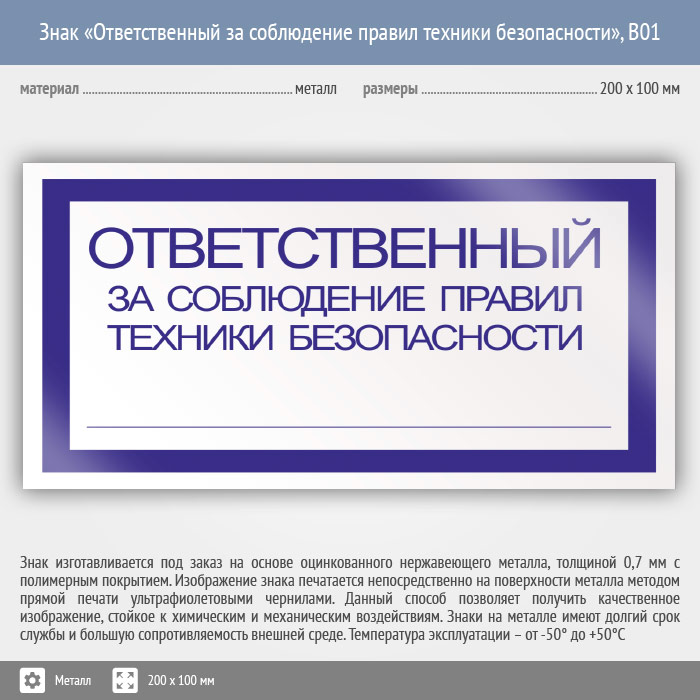 Знак «Ответственный за соблюдение правил техники безопасности», B01 (металл, 200х100 мм) в Черкесске купить