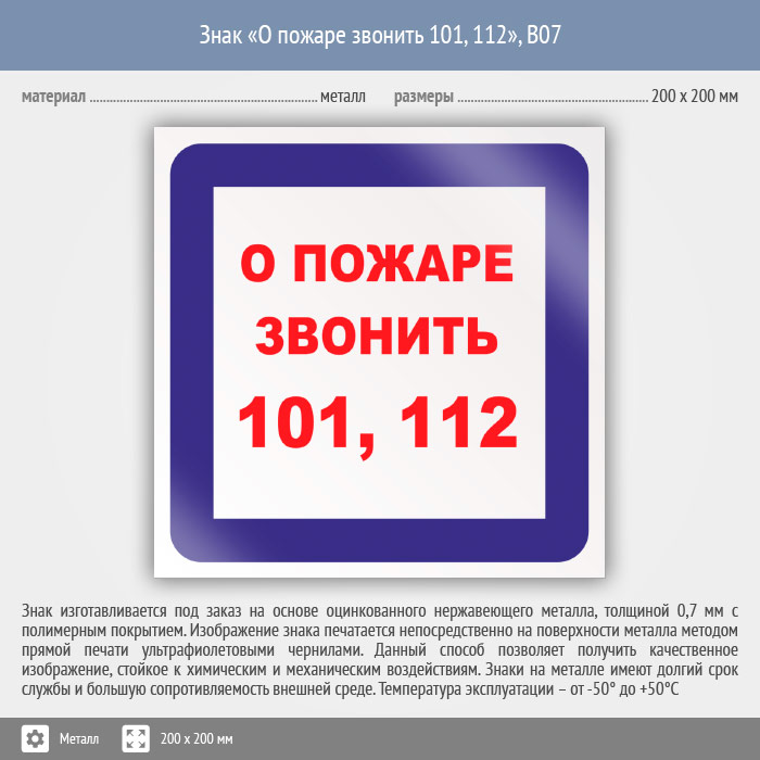 Знак «О пожаре звонить 101, 112», B07 (металл, 200х200 мм) в Черкесске купить