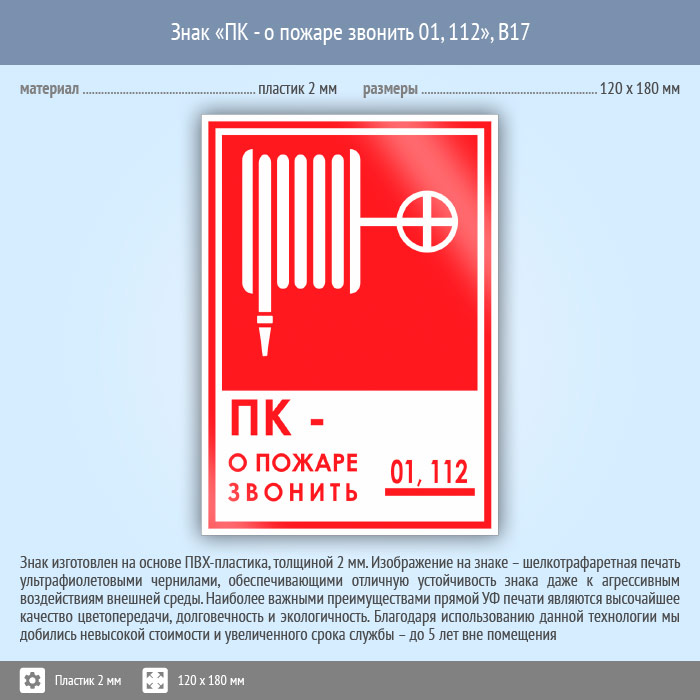 Знак «ПК - о пожаре звонить 01, 112», B17 (пластик, 120х180 мм) в Черкесске купить