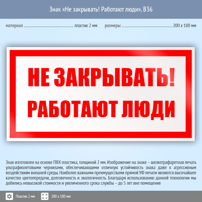 Знак «Не закрывать! Работают люди», B36 (пластик, 200х100 мм) в Черкесске купить