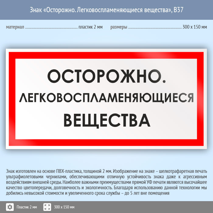 Знак «Осторожно. Легковоспламеняющиеся вещества», B37 (пластик, 300х150 мм) в Черкесске купить