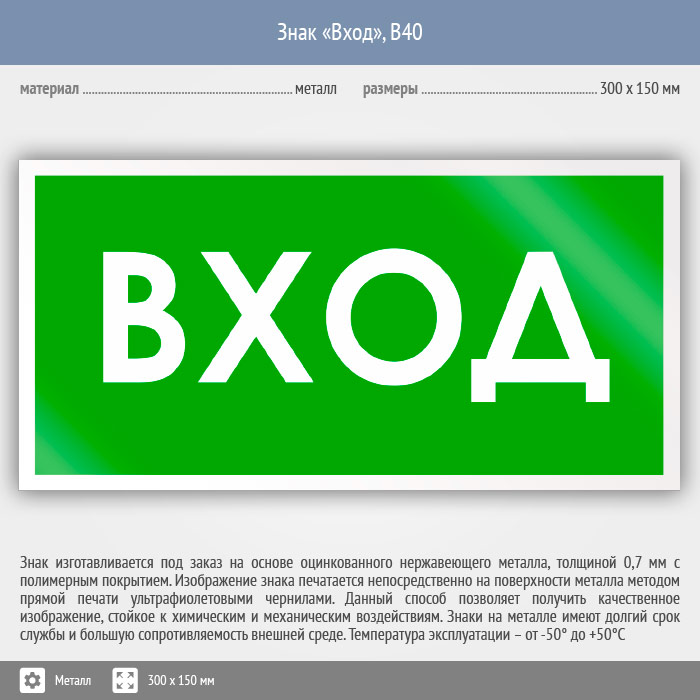 Знак «Вход», B40 (металл, 300х150 мм) в Черкесске купить