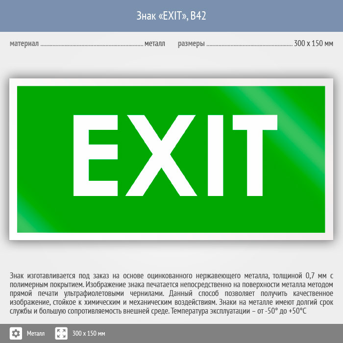 Знак «EXIT», B42 (металл, 300х150 мм) в Черкесске купить
