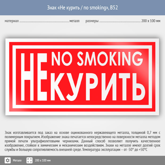 Знак «Не курить / no smoking», B52 (металл, 200х100 мм) в Черкесске купить