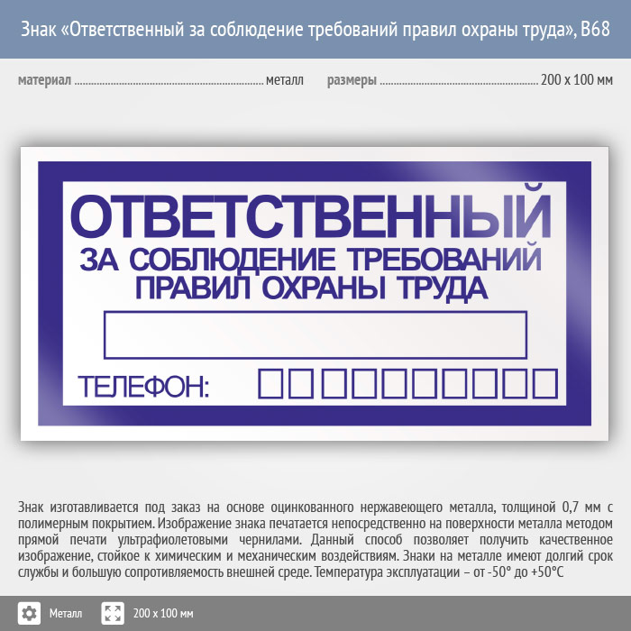 Знак «Ответственный за соблюдение требований правил охраны труда», B68 (металл, 200х100 мм) в Черкесске купить