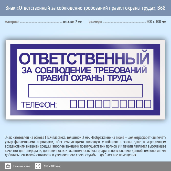 Знак «Ответственный за соблюдение требований правил охраны труда», B68 (пластик, 200х100 мм) в Черкесске купить