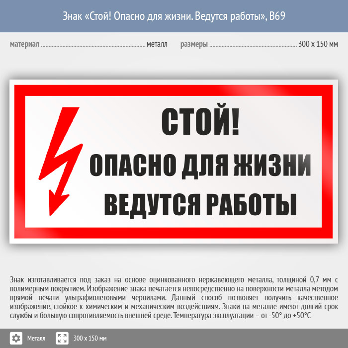 Знак «Стой! Опасно для жизни. Ведутся работы», B69 (металл, 300х150 мм) в Черкесске купить