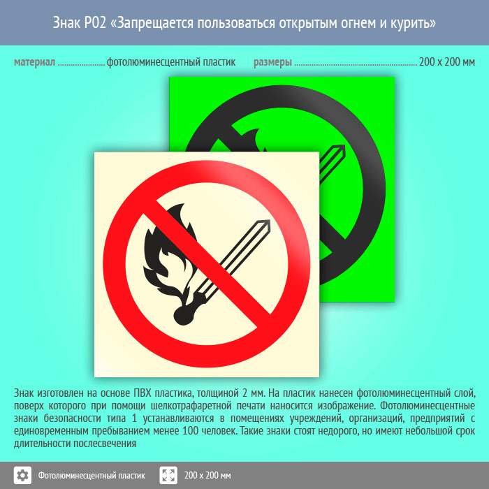 Знак P02 «Запрещается пользоваться открытым огнем и курить» (фотолюминесцентный пластик, 200х200 мм) в Черкесске купить